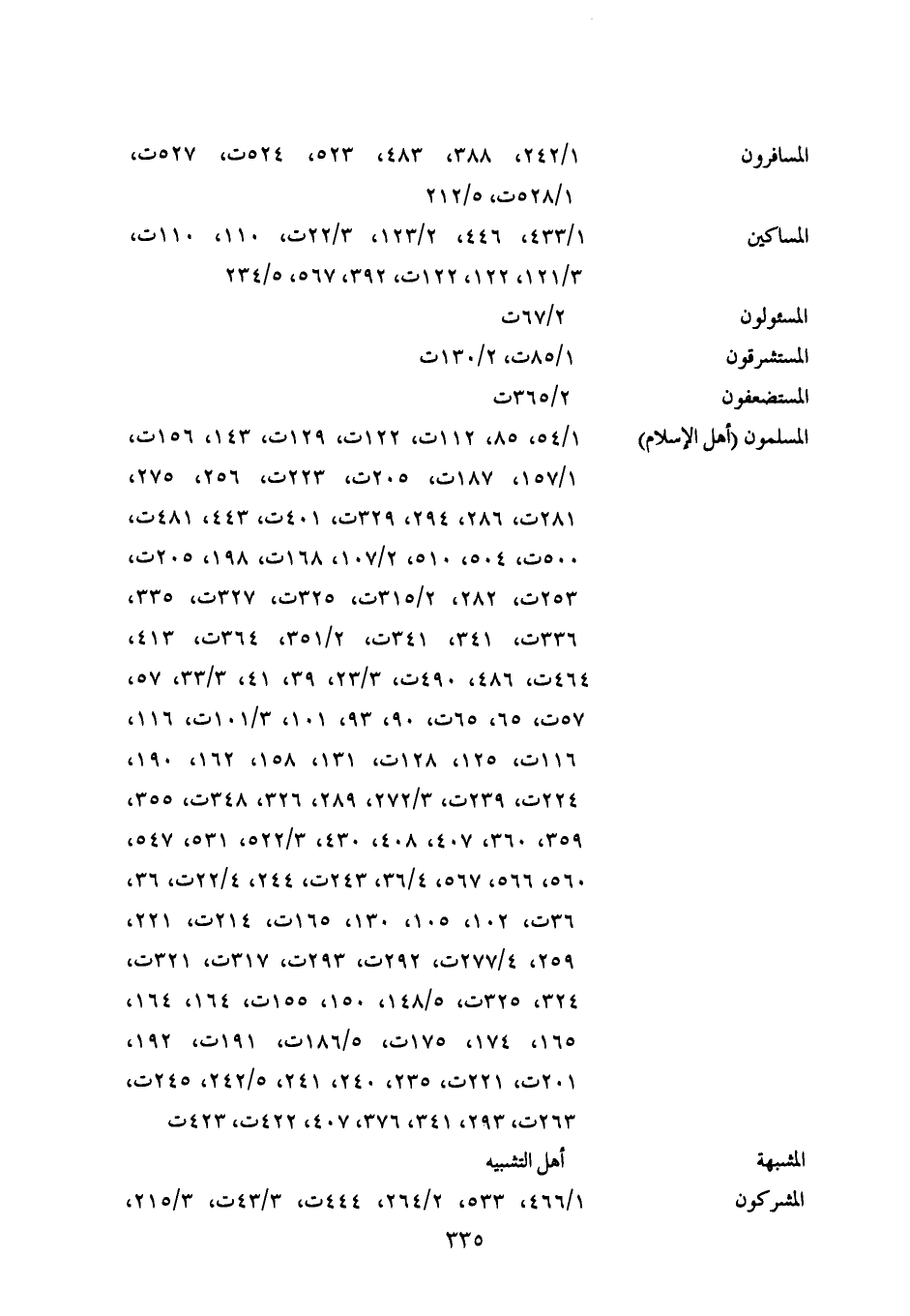 المسلمون "أهل الإسلام" 1/54، 85، 112ت، 122ت، 129ت، 143، 156ت، 1/157، 187ت، 205ت، 223ت، 256، 275، 281ت، 286، 294، 329ت، 401ت، 443، 481ت، 500ت504، 510، 2/107، 168ت، 198، 205ت، 253ت، 282، 2/315ت، 325ت، 327ت، 335، 336ت، 341، 341ت، 2/351، 364ت، 413، 464ت، 486، 490ت، 3/23، 39، 41، 3/33، 57، 57ت، 65، 65ت، 90، 93، 101، 3/101ت، 116، 116ت، 125، 128ت، 131، 158، 162، 190، 224ت، 239ت، 3/272، 289، 326، 348ت، 355، 359، 360، 407، 408، 430، 3/522، 531، 547، 560، 566، 567، 4/36، 243ت، 244، 4/22ت، 36، 36ت، 102، 105، 130، 165ت، 214ت، 221، 259، 4/277ت، 292ت، 293ت، 317ت، 321ت، 324، 325ت، 5/148، 150، 155ت، 164، 164، 165، 174، 175ت، 5/186ت، 191ت، 192، 201ت، 221ت، 235، 240، 241، 5/242، 245ت، 263ت، 293، 341، 376، 407، 422ت، 423ت