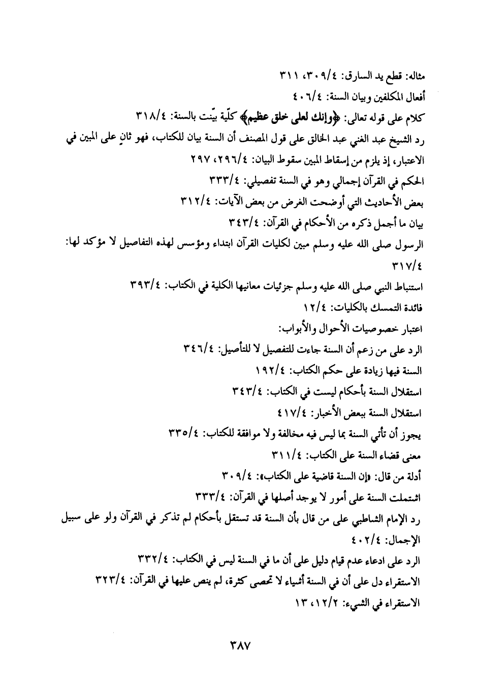 الِاسْتِقْرَاءَ دَلَّ عَلَى أَنَّ فِي السُّنَّةِ أَشْيَاءَ لَا تُحْصَى كَثْرَةً، لَمْ يُنَصَّ عَلَيْهَا فِي القرآن: 4/ 323
