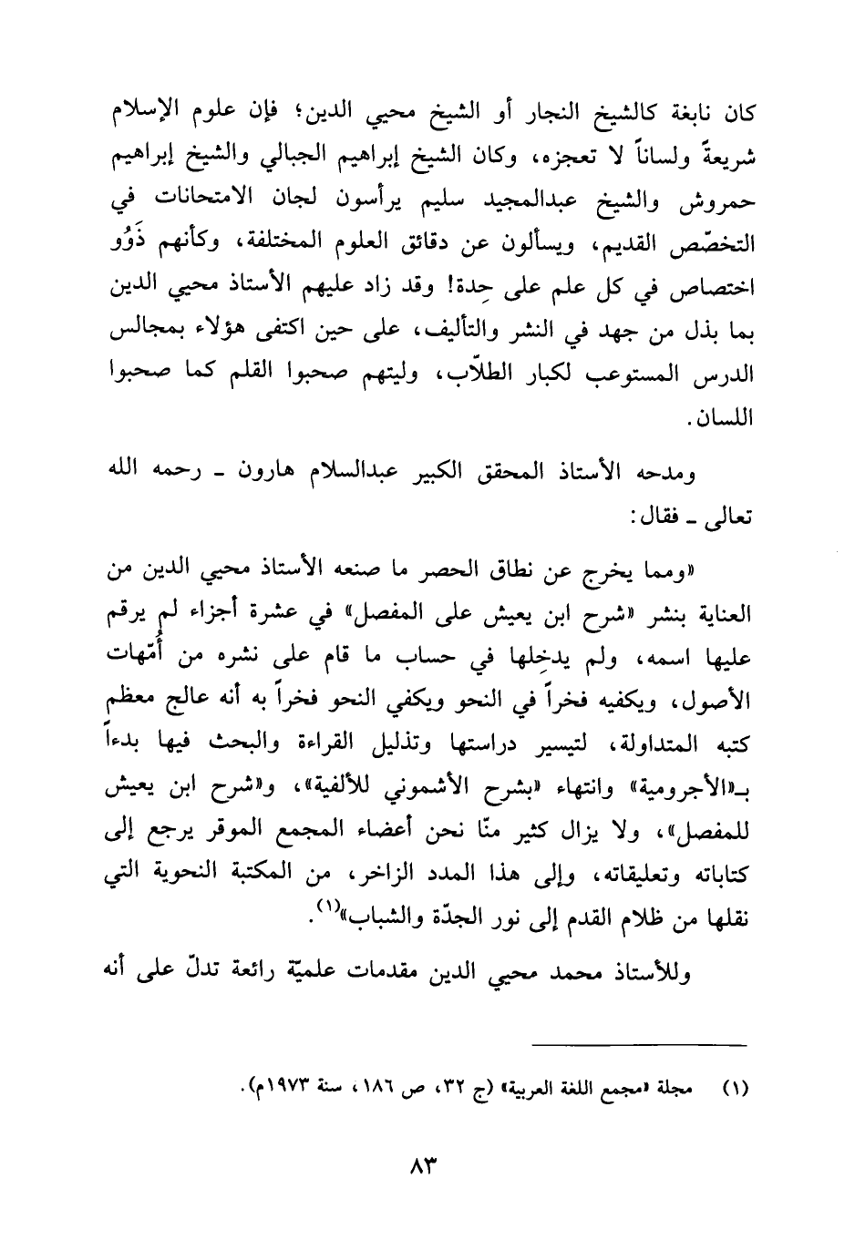 "ومما يخرج عن نطاق الحصر ما صنعه الأستاذ محيي الدين من العناية بنشر "شرح ابن يعيش على المفصل" في عشرة أجزاء لم يرقم عليها اسمه، ولم يدخلها في حساب ما قام على نشره من أمهات الأصول، ويكفيه فخرًا في النحو ويكفي النحو فخرًا به أنه عالج معظم كتبه المتداولة، لتيسير دراستها وتذليل القراءة، والبحث فيها بدءًا بـ "الأجرومية" وانتهاء "بشرح الأشموني للألفية"، و "شرح ابن يعيش للمفصل"، ولا يزال كثير منا نحن أعضاء المجمع الموقر يرجع إلى كتاباته وتعليقاته، وإلى هذا المدد الزاخر، من المكتبة النحوية التي نقلها من ظلام القدم إلى نور الجدة والشباب"1.