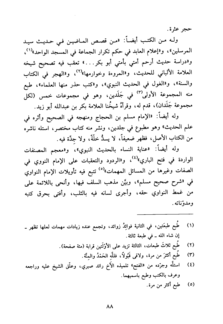 وله من الكتب أيضا: "من قصص الماضين في حديث سيد المرسلين"، و "إعلام العابد في حكم تكرار الجماعة في المسجد الواحد"1، و "دراسة حديث أرحم أمتي بأمتي أبو بكر.." تعقب فيه تصحيح شيخه العلامة الألباني للحديث، و "المروءة وخوارمها"2، و "الهجر في الكتاب والسنة"، و "الغول في الحديث النبوي"، و "كتب حذر منها العلماء"، طبع منه المجموعة الأولى3 في جَلَدين، وهو في مجموعات خمس "لكل مجموعة جلدان"، قدم له، وقرأه شيخنا العلامة بكر بن عبد الله أبو زيد.