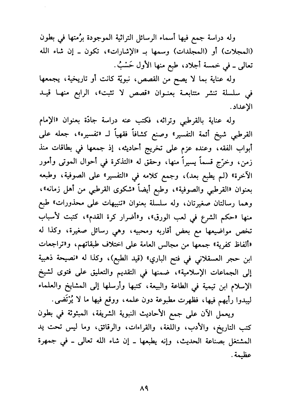 وله عناية بالقرطبي وتراثه، فكتب عنه دراسة جادة بعنوان "الإمام القرطبي شيخ أئمة التفسير" وصنع كشافًا فقهيًّا لـ "تفسيره"، جعله على أبواب الفقه، وعنده عزم على تخريج أحاديثه، إذ جمعها في بطاقات منذ زمن، وخرج قسمًا يسيرًا منها، وحقق له "التذكرة في أحوال الموتى وأمور الآخرة" "لم يطبع بعد"، وجمع كلامه في "التفسير" على الصوفية، وطبعه بعنوان "القرطبي والصوفية"، وطبع أيضا "شكوى القرطبي من أهل زمانه"، وهما رسالتان صغيرتان، وله سلسلة بعنوان "تنبيهات على محذورات" طبع منها "حكم الشرع في لعب الورق"، و "أضرار كرة القدم"، كتبت لأسباب تخص مواضيعها مع بعض أقاربه ومحبيه، وهي رسائل صغيرة، وكذا له "ألفاظ كفرية" جمعها من مجالس العامة على اختلاف طبقاتهم، و "تراجعات ابن حجر العسقلاني في فتح الباري" "قيد الطبع"، وكذا له "نصيحة ذهبية إلى الجماعات الإسلامية"، ضمنها في التقديم والتعليق على فتوى لشيخ الإسلام ابن تيمية في الطاعة والبيعة، كتبها وأرسلها إلى المشايخ والعلماء ليبدوا رأيهم فيها، فظهرت مطبوعة دون علمه، ووقع فيها ما لا يرتضي.