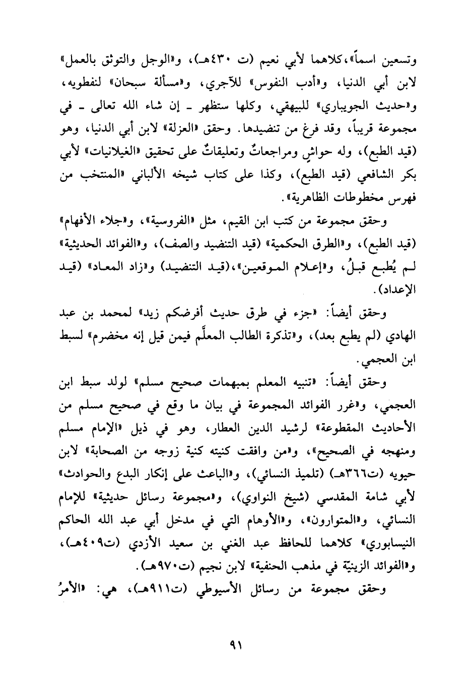 وتسعين اسمًا" كلاهما لأبي نعيم "ت430هـ"، و "الوجل والتوثق بالعمل" لابن أبي الدنيا، و "أدب النفوس" للآجري، و "مسألة سبحان" لنفطويه، و "حديث الجويباري" للبيهقي، وكلها ستظهر -إن شاء الله تعالى- في مجموعة قريبًا، وقد فرغ من تنضيدها. وحقق "العزلة" لابن أبي الدنيا، وهو "قيد الطبع"، وله حواش ومراجعات وتعليقات على تحقيق "الغيلانيات" لأبي بكر الشافعي "قيد الطبع"، وكذا على كتاب شيخه الألباني "المنتخب من فهرس مخطوطات الظاهرية".