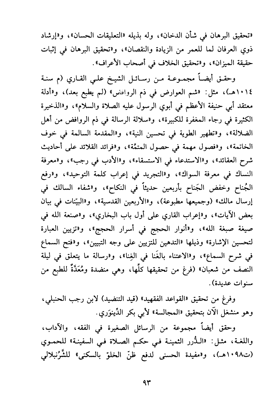 وحقق أيضا مجموعة من رسائل الشيخ على القاري "م سنة 1014هـ"، مثل: شم العوار في ذم الروافض "لم يطبع بعد"، و "أدلة معتقد أبي حنيفة الأعظم في أبوي الرسول عليه الصلاة والسلام"، و "الذخيرة الكثيرة في رجاء المغفرة للكبيرة"، و "سلالة الرسالة في ذم الروافض ضمن أهل الضلالة"، و "تطهير الطوية في تحسين النية"، و "المقدمة السالمة في خوف الخاتمة"، و "فصول مهمة في حصول المتمة"، و "فرائد القلائد على أحاديث شرح العقائد"، و "الاستدعاء في الاستسقاء"، و "الأدب في رجب"، و "معرفة النساك في معرفة السواك"، و "التجريد في إعراب كلمة التوحيد"، و "رفع الجناح وخفض الجناح بأربعين حديثًا في النكاح"، و "شفاء السالك في إرسال مالك" "وجميعها مطبوعة"، و "الأربعين القدسية"، و "البينات في بيان بعض الآيات"، و "إعراب القاري على أول باب البخاري"، و "صنعة الله في صيغة صبغة الله"، و "أنوار الحجج في أسرار الحجج"، و "تزيين العبارة لتحسين الإشارة" وذيلها "التدهين للتزيين على وجه التبيين"، و "فتح السماع في شرح السماع"، والاعتناء بالغَنا في الغِنا"، و "رسالة ما يتعلق في ليلة النصف من شعبان" "فرغ من تحقيقها كلها، وهي منضدة ومعدة للطبع من سنوات عديدة".