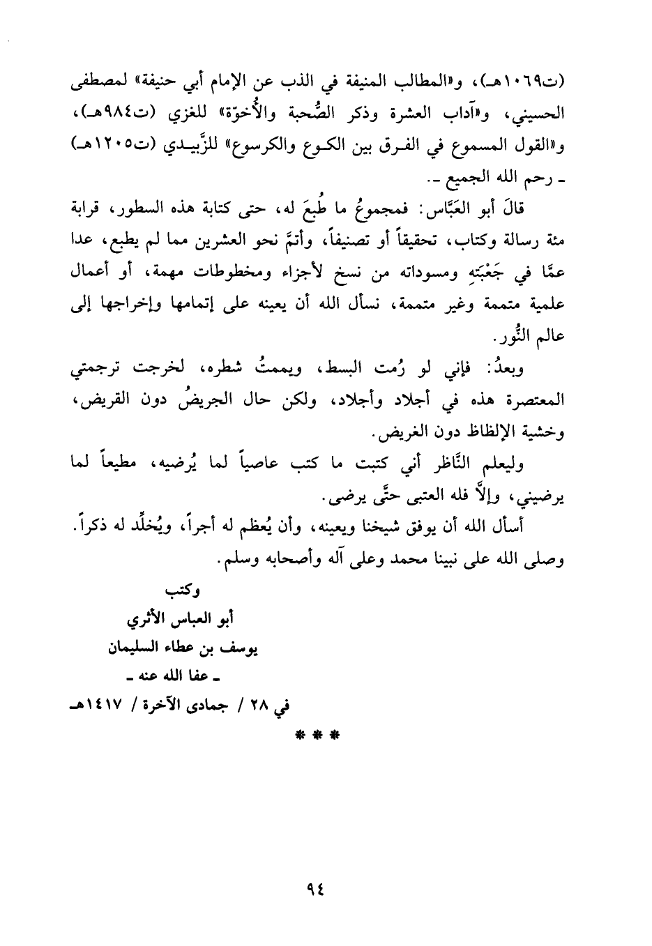 "ت 1096هـ"، و "المطالب المنيفة في الذب عن الإمام أبي حنيفة" لمصطفي الحسيني، و "آداب العشرة وذكر الصحبة والأخوة" للغزي "ت 984هـ"، و "القول المسموع في الفرق بين الكوع والكرسوع" للزبيدي "ت 1205هـ" -رحم الله الجميع-.