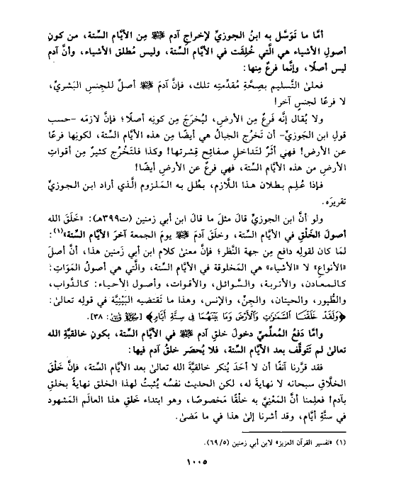 أمَّا ما تَوَسَّل به ابنُ الجوزيِّ لإخراجِ آدم عليه السلام مِن الأيَّام السِّتة، من كونِ أصولِ الأشياء هي الَّتي خُلِقَت في الأيَّام السِّتة، وليس مُطلق الأشياء، وأنَّ آدم ليس أصلًا، وإنَّما فرعٌ مِنها: