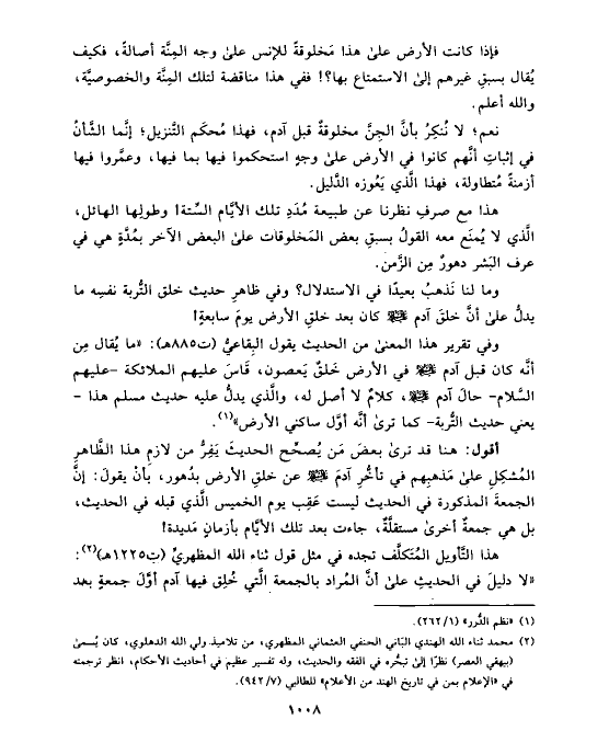 هذا التَّأويل المُتَكلَّف تجده في مثل قول ثناء الله المظهريِّ (ت ١٢٢٥ هـ) (¬٢): «لا دليلَ في الحديثِ على أنَّ المُراد بالجمعة الَّتي خُلِق فيها آدم أوَّلَ جمعةٍ بعد