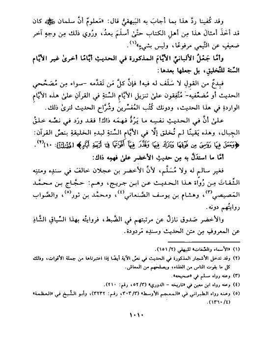 وأمَّا جَعْلُ الألبانيِّ الأيَّامَ المذكورة في الحديثِ أيَّامًا أخرى غير الأيَّام السِّتة للتَّخليقِ، بل جعلها بعدها: