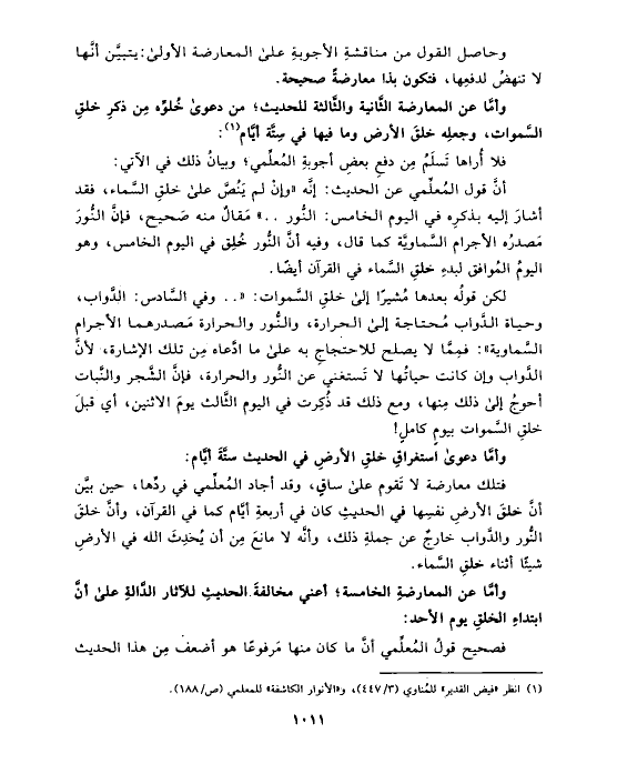 فتلك معارضة لا تَقوم على ساقٍ، وقد أجاد المُعلِّمي في ردِّها، حين بيَّن أنَّ خلقَ الأرضِ نفسِها في الحديثِ كان في أربعةِ أيَّام كما في القرآن، وأنَّ خلقَ النُّور والدَّواب خارجٌ عن جملةِ ذلك، وأنَّه لا مانعَ مِن أن يُحدِثَ الله في الأرضِ شيئًا أثناء خلقِ السَّماء.