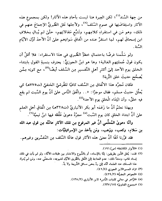 من جِهة السَّند (¬١)؛ لكن العِبرة هنا ليست بآحادِ هذه الآثار! ولكن بمجموعِ هذه الآثار واستِفاضَتِها في عمومِ السَّلف (¬٢)، ولأجلها نَقل الطَّبريُّ الإجماعَ عنهم في ذلك، وهو مَن في استقراءِ كلامِهم، وتَتبُّعِ مَقالاتِهم، حتَّى لم يُبالِ بخلافِ ابن إسحاقَ لهم، لمِا استقرَّ عنده من اتِّفاقِ سَوادِهم على أنَّ الأحدَ أوَّل الأيَّام السِّتة.
