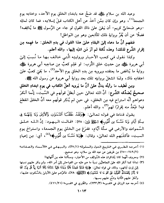 وعبد الله بن سلام رضي الله عنه قد صَحَّ عنه بابتداءِ الخلقِ يوم الأحد، وختامِه يوم الجمعة (¬١)، وهو وإن كان مِمَّن أخذَ عن أهلِ الكتاب قبلَ إسلامِه، فما كان لمثلِه -وهو صَحابيٌّ كريم- أن يَبقى على ذاك القولِ لو جاء عن الرَّسول صلى الله عليه وسلم ما يُناقِضه! فضلًا عن أن يُقَرَّ بروايةِ ذلك للتَّابعين وهو مِن البَواطل!