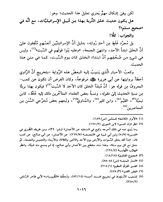 وكعبُ الأحبار الَّذي يَنسِبُ إليه البعضُ هذه الرِّواية -بتخريجِ أنَّ الرَّاوي أخطَأ بروايتِها عن أبي هريرة رضي الله عنه مَرفوعةً، وكان الفرض أن تكون عن كعب- المعروفُ مِن قولِه هو: أنَّ مُبتدَأ الخلق كان الأحَد لا السَّبت (¬٢)!