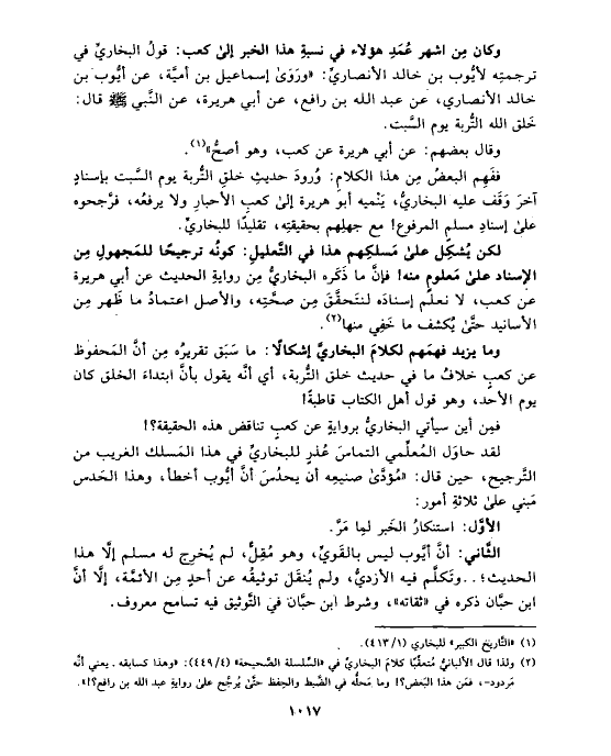 وكان مِن اشهر عُمَدِ هؤلاء في نسبةِ هذا الخبر إلى كعب: قولُ البخاريِّ في ترجمتِه لأيُّوب بن خالد الأنصاريِّ: «ورَوَى إسماعيل بن أميَّة، عن أيُّوب بن خالد الأنصاري، عن عبد الله بن رافع، عن أبي هريرة، عن النَّبي صلى الله عليه وسلم قال: خَلق الله التُّربة يوم السَّبت.
