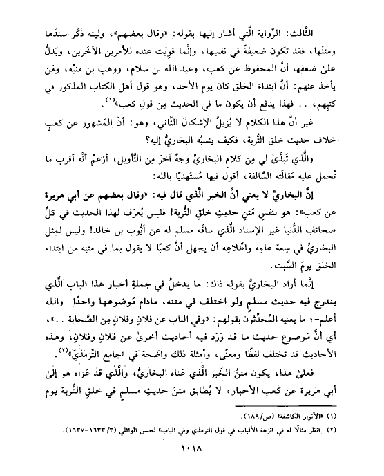 فعلى هذا، يكون متنُ الخَبر الَّذي عَناه البخاريُّ، والَّذي قد عَزاه هو إلى أبي هريرة عن كعب الأحبار، لا يُطابق متنَ حديثِ مسلمٍ في خلقِ التُّربة يوم