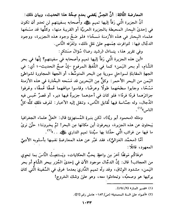 أنَّ الجزيرة الَّتي رَفأَ إليها تميم رضي الله عنه وأصحابه بسفينِتهم لن تعدو أن تكون في إحدى البِحار المحيطة بالجزيرة العربيَّة أو القريبة منها، وكلُّها قد مسَحَها علماء البِحار في هذه الأزمنة مَسحًا؛ فلو صَحَّ وجود هذه الجزيرة، ووجود الدجَّال فيها: لتوافرت هِمَمهم على نقلِ ذلك، ولعَرَفه النَّاس.