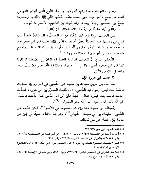 والتَّحقيق عندي أنَّ الحديث قد تابعَ فاطمةَ فيه اثنان مِن الصَّحابة لا ثلاثة كما قال ابن حجر، أعني بالاثنين: أبا هريرة، وعائشة؛ فأمَّا جابر فلا يثبتُ عنه؛ وتفصيل ذلك في الآتي: