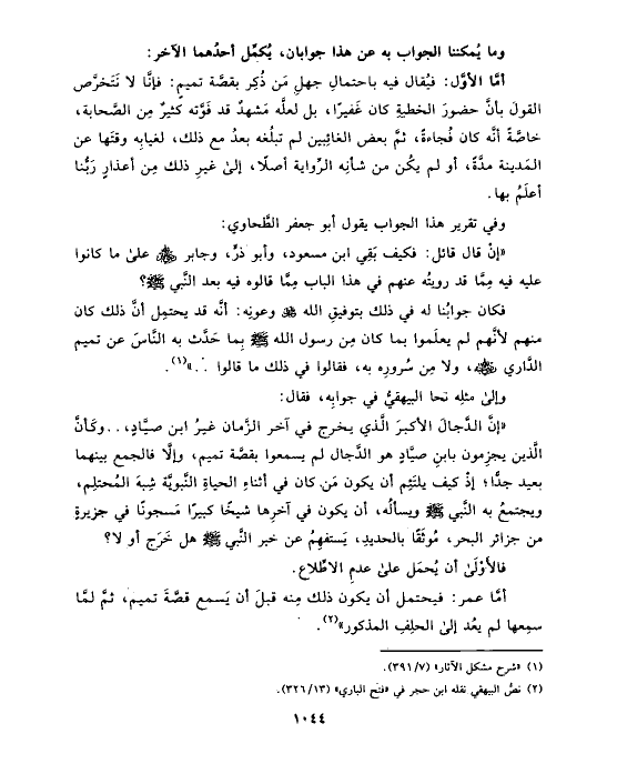 فكان جوابُنا له في ذلك بتوفيقِ الله عز وجل وعونِه: أنَّه قد يحتمِل أنَّ ذلك كان منهم لأنَّهم لم يعلَموا بما كان مِن رسول الله صلى الله عليه وسلم بِما حَدَّث به النَّاسَ عن تميم الدَّاري رضي الله عنه، ولا مِن سُرورِه به، فقالوا في ذلك ما قالوا .. » (¬١).