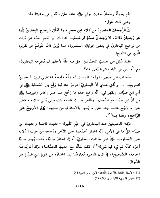 فكِلا الحديثين عند البخاريِّ في حيِّزِ القَبول -حديث فاطمة وحديث ابنِ صيَّا- كلُّ ما في الأمرِ، أنَّه اختارَ أحدَهما على الآخر ورَّجحه من حيث الدَّلالة على المَطلوب، فإنَّ «مِن عاداتِ البخاريِّ أنَّه إذا اختارَ جانِبًا، ذَهب يُهدِر جانبًا آخرَ، كأنَّه لم يَرِد فيه شيءٌ» (¬٢)؛ فكذا شأنُه مع حديثِ الجسَّاسة، ترَك أن يُدخلَه «جامِعَه الصَّحيح»، إذْ كان ظاهره مُعارِضًا لِما اختارَه مِن كونِ ابنِ صيَّادٍ هو الدَّجالَ.