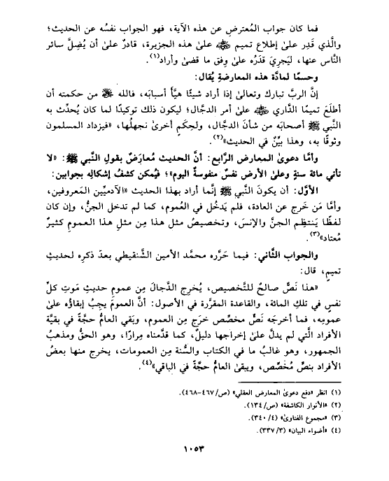 «هذا نَصٌّ صالحٌ للتَّخصيص، يُخرِج الدَّجالَ مِن عمومِ حديثِ مَوتِ كلِّ نفسٍ في تلكِ المائة، والقاعدة المقرَّرة في الأصول: أنَّ العمومَ يجِبُ إبقاؤُه على عمومِه، فما أخرجَه نَصٌّ مخصِّص خرَج مِن العموم، وبَقي العامُّ حجَّةً في بقيَّة الأفراد الَّتي لم يدلَّ على إخراجها دليلٌ، كما قدَّمناه مِرارًا، وهو الحقُّ ومذهبُ الجمهور، وهو غالبُ ما في الكتاب والسُّنة مِن العمومات، يخرج منها بعضُ الأفراد بنصٍّ مُخصِّص، ويبقى العامُّ حجَّةً في الباقي» (¬٤).