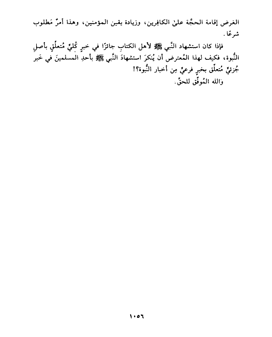 فإذا كان استشهاد النَّبي صلى الله عليه وسلم لأهل الكتابِ جائزًا في خبرٍ كُليٍّ مُتعلِّقٍ بأصلِ النُّبوة، فكيف لهذا المُعترض أن يُنكرَ استشهادَ النَّبي صلى الله عليه وسلم بأحدِ المسلمينَ في خَبر جُزئيٍّ مُتعلِّق بخبرٍ فرعيٍّ مِن أخبار النُّبوة؟!