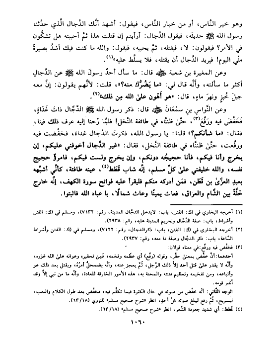 وعن النَّواسِ بنِ سمْعَانَ رضي الله عنه قال: ذكر رسول الله صلى الله عليه وسلم الدَّجَّال ذاتَ غَدَاةٍ، فَخَفَّضَ فيه ورَفَّعَ (¬٣)،