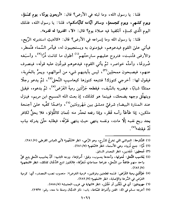 قلنا: يا رسول الله، وما لبثه في الأرض؟ قال: «أربعون يومًا، يوم كسَنةٍ، ويوم كشهرٍ، ويوم كجمعةٍ، وسائر أيَّامه كأيَّامكم»، قلنا: يا رسول الله، فذلك اليوم الَّذي كسنةٍ، أتكفينا فيه صلاة يوم؟ قال: «لا، اقدروا له قدره».