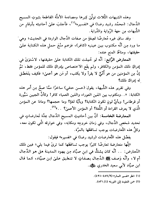 وهذه الشبهات الثَّلاث تولَّى كِبرها ومصادمة الأدلَّة القاطعة بثبوتِ المسيح الدَّجال: (محمَّد رشيد رضا) في «تفسيره» (¬١)، فأجلبَ على أحاديثه بأوقارٍ من الشُّبهات مِن جهة الرِّواية والدِّراية.