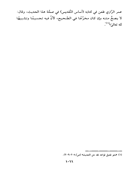 عمر الرَّازي طعن في كتابه (أساس التَّقديس) في صحَّة هذا الحديث، وقال: لا يصحُّ متنه وإن كان مخرَّجًا في الصَّحيح، لأنَّ فيه تجسيمًا وتشبيهًا لله تعالى» (¬١).