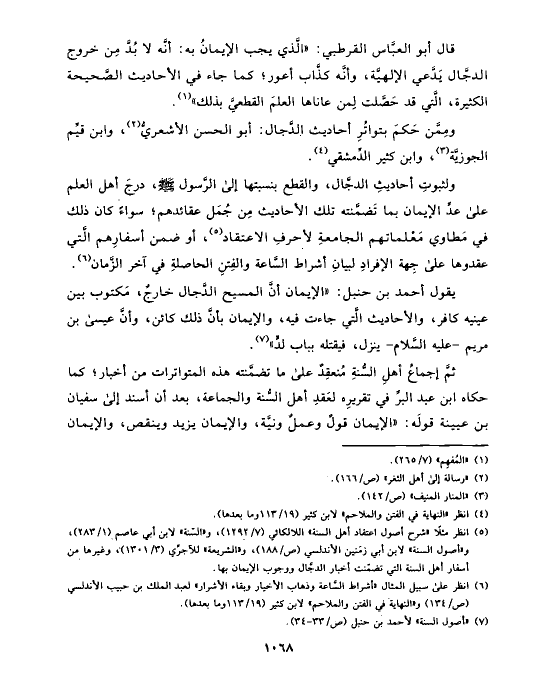ولثبوتِ أحاديثِ الدجَّال، والقطع بنسبتها إلى الرَّسول صلى الله عليه وسلم، درجَ أهل العلم على عدِّ الإيمان بما تَضمَّنته تلك الأحاديث مِن جُمَل عقائدهم؛ سواءً كان ذلك في مَطاوي مَعْلماتهم الجامعةِ لأحرفِ الاعتقاد (¬٥)، أو ضمن أسفارِهم الَّتي عقدوها على جِهة الإفرادِ لبيانِ أشراط السَّاعة والفِتنِ الحاصلةِ في آخر الزَّمان (¬٦).