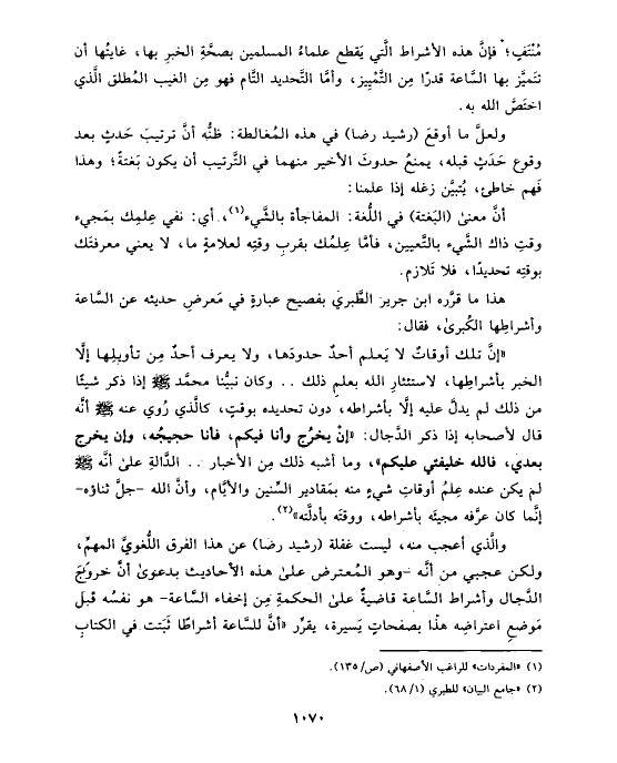 والَّذي أعجب منه، ليست غفلة (رشيد رضا) عن هذا الفرق اللُّغويَّ المهمِّ، ولكن عجبي من أنَّه -وهو المُعترض على هذه الأحاديث بدعوى أنَّ خروجَ الدَّجال وأشراط السَّاعة قاضيةٌ على الحكمةِ مِن إخفاء السَّاعة- هو نفسُه قبل مَوضعِ اعتراضِه هذا بصفحاتٍ يَسيرة، يقرِّر «أنَّ للسَّاعة أشراطًا ثَبَتت في الكتابِ