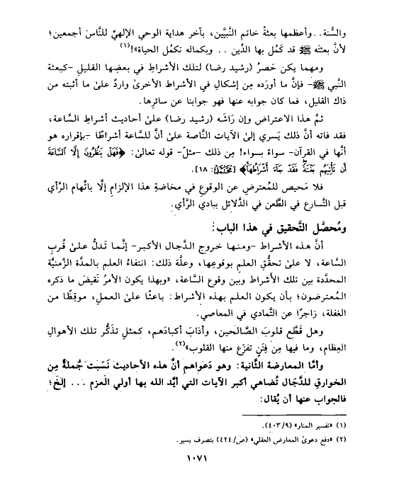 ثمَّ هذا الاعتراض وإن رَاشَه (رشيد رضا) على أحاديث أشراطِ السَّاعة، فقد فاته أنَّ ذلك يَسري إلى الآيات النَّاصة على أنَّ للسَّاعة أشراطًا -بإقراره هو أنَّها في القرآن- سواءً بسواء! مِن ذلك -مثلً- قوله تعالى: {فَهَلْ يَنظُرُونَ إِلَاّ السَّاعَةَ أَن تَأْتِيَهُم بَغْتَةً فَقَدْ جَاءَ أَشْرَاطُهَا} [محمد: ١٨].