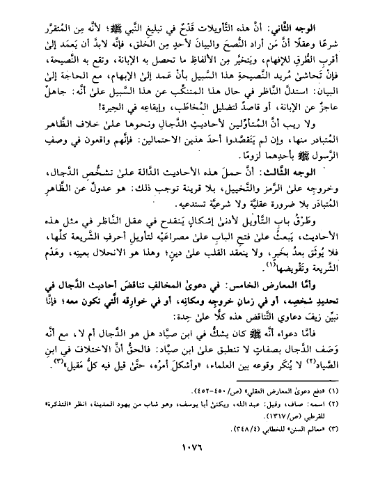 الوجه الثَّالث: أنَّ حملَ هذه الأحاديث الدَّالة على تشخُّصِ الدَّجال، وخروجِه على الرَّمز والتَّخييل، بلا قرينة توجب ذلك: هو عدولٌ عن الظَّاهرِ المُتبادَر بلا ضرورة عقليَّة ولا شرعيَّة تستدعيه.