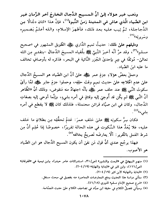 وذهب غير هؤلاء إلى أنَّ المسيح الدَّجال الخارجَ آخر الزَّمان غير ابن الصَّياد الَّذي عاش في المدينة زمنَ النُّبوة (¬١)، فإنَّ هذا «كان دجَّالًا مِن الدَّجاجلة، ثمَّ تِيب عليه بعد ذلك، فأظهرَ الإسلام، والله أعلمُ بَضميرِه وسَريرتِه» (¬٢).