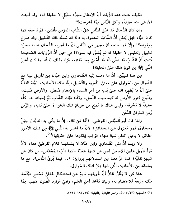 ولا ريب أنَّ مثل الطَّحاوي وابن حبَّان لا يشملهما كلام القرطبيِّ هذا، لأنَّ مَردَّ تأويل هذين الإمامين ليس عن شبهةٍ عقليَّة -كما دأبُ المُحْدَثين- بل كان عن شبهةٍ نقليَّة؛ كما مَرَّ معنا مِن استدلالهم بروايةِ: « .. فيما يَرى النَّاس»، مع ما يعلمانه مِن الأحاديث الَّتي فيها ذِكرٌ لتلك الخوارق.