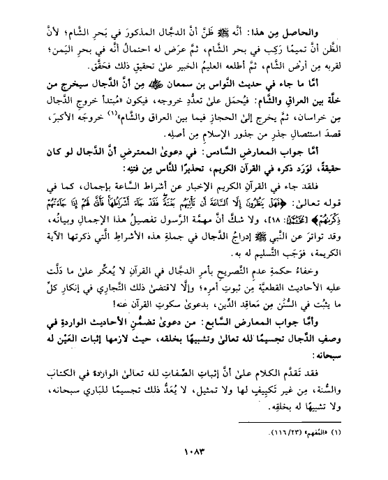 أمَّا جواب المعارضِ السَّادس: في دعوى المعترضِ أنَّ الدَّجال لو كان حقيقةً، لوَرَد ذكره في القرآن الكريم، تحذيرًا للنَّاس مِن فتنِه: