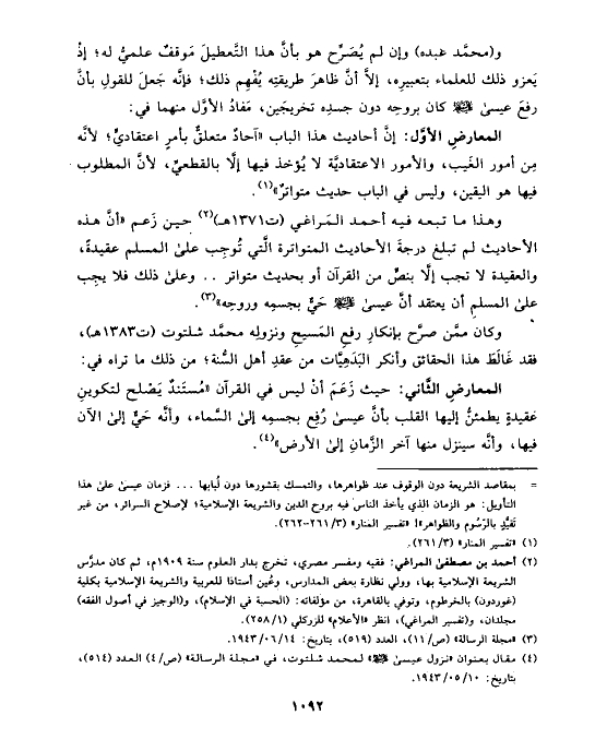 وهذا ما تبعه فيه أحمد المَراغي (ت ١٣٧١ هـ) (¬٢) حين زَعم «أنَّ هذه الأحاديث لم تبلغ درجةَ الأحاديث المتواترة الَّتي تُوجِب على المسلم عقيدةً، والعقيدة لا تجب إلَّا بنصٍّ من القرآن أو بحديث متواتر .. وعلى ذلك فلا يجِب على المسلمِ أن يعتقد أنَّ عيسى عليه السلام حَيٌّ بجسمِه وروحِه» (¬٣).