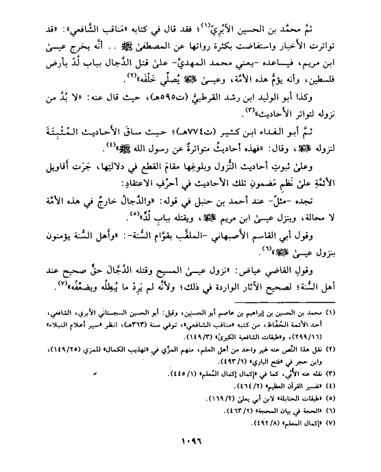 ثمَّ محمَّد بن الحسين الآبُرِيّ (¬١)؛ فقد قال في كتابه «مَناقب الشَّافعي»: «قد تواترت الأَخبار واستفاضت بكثرة رواتها عن المصطفى صلى الله عليه وسلم .. أنَّه يخرج عيسى ابن مريم، فيساعده -يعني محمد المهديَّ- على قتل الدَّجال بباب لُدّ بأرض فلسطين، وأنه يؤمُّ هذه الأمَّة، وعيسى عليه السلام يُصلِّي خَلْفَه» (¬٢).