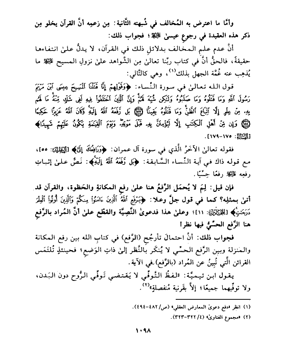 وأمَّا ما اعترض به المُخالف في شُبهته الثَّانية: مِن زعمِه أنَّ القرآن يخلو مِن ذكر هذه العقيدة في رجوعِ عيسى عليه السلام؛ فجواب ذلك:
