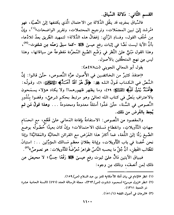 «اِعتقدَ كثيرٌ من الخائضين في الأُصول عزَّة النُّصوص، حتَّى قالوا: إنَّ النَّصَّ في الكتاب قَولُ الله عز وجل: {قُلْ هُوَ اللَّهُ أَحَدٌ} [الإخلاص: ١]، وقولُه: {مُّحَمَّدٌ رَّسُولُ اللَّهِ} [الفتح: ٢٩]، وما يظهر ظهورهما! ولا يكاد هؤلاء يسمَحون بالاعترافِ بنَصٍّ في كتاب الله تعالى وهو مرتبط بحكم شرعيٍّ، وقضوا بِنُدُورِ النُّصوص في السُّنة، حتَّى عَدُّوا أَمثلةً معدودةً ومحدودةً ... وهذا قولُ مَن لم يُحِط بالغَرض من ذلك.