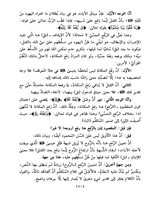 وهذا نَصٌّ في الرَّفْعِ الحِسِّيّ لا مَحالة؛ لأنَّ الإيقاف بـ (بل) هنا الَّتي تفيد الإضرابَ والإبطال، هو لنِفْيِ ما ظنَّ اليهود مِن تسلُّطهم على نبيِّ الله بالقتل، فيكون ما بعد (بل) مُنافيًا لما قبلها، بتكريرِ عدمِ تمكينِ الله لهم مِن التَّسلُّط على نبيِّه؛ وذلك برفعِه رفعًا حِسِّيًا، ولو كان المرادُ رَفعَ المكانةِ، لاختلَّ بذلك النَّظْمُ القرآنيُّ؛ لأمرين:
