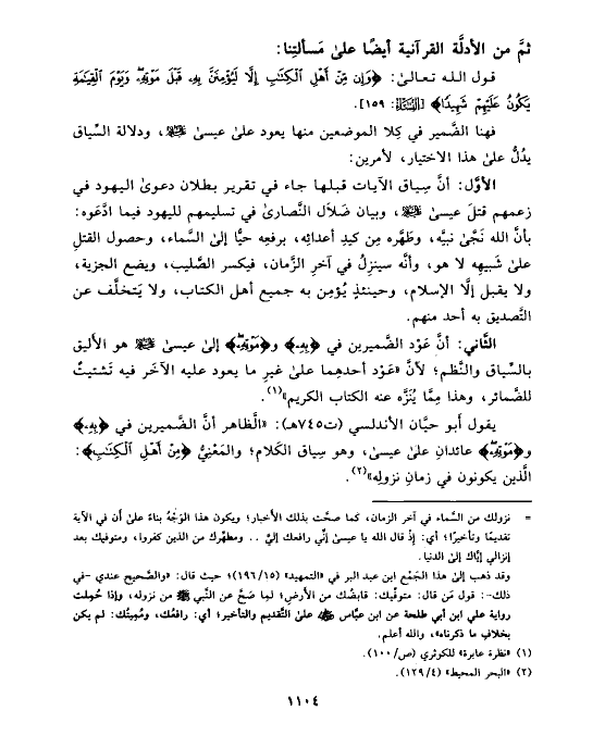 يقول أَبو حيَّان الأندلسي (ت ٧٤٥ هـ): «الَّظاهر أنَّ الضَّميرين في {بِهِ} و {مَوْتِهِ} عائدانِ على عيسى، وهو سِياق الكَلام؛ والمَعْنِيُّ {مِّنْ أَهْلِ الْكِتَابِ}: الَّذين يكونون في زمانِ نزولِه» (¬٢).