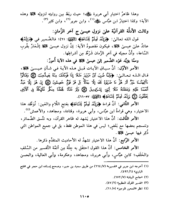 قول الله تعالى: {وَإِنَّهُ لَعِلْمٌ لِّلسَّاعَةِ} [الزخرف: ٦١]؛ فالضَّمير في {وَإِنَّهُ} عائدٌ على عيسى عليه السلام، فيكون مَقصودُ الآية: إنَّ نزول عيسى عليه السلام إشْعَارٌ بقُربِ السَّاعة، وأَنَّ مجيئَه في آخرِ الزَّمان شَرْطٌ مِن أشراطِها.