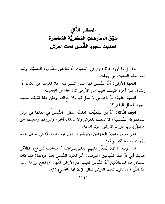 « .. ومنه ما كان يَتَعذَّر عليهم العلم بموافقته أو مخالفته للواقع، كظاهر حديث أبي ذرِّ عند الشَّيخين وغيرهما: أين تكون الشَّمس بعد غروبها؟ فقد كان المتبادَر منه للمتقدِّمين أنَّ الشَّمس تغيب عن الأرض كلِّها، وينقطع نورها عنها مدَّة اللَّيل؛ إذ تكون تحت العرش تنتظر الإذن لها بالطُّلوع ثانية.