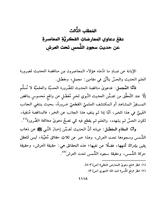 وأمَّا المقام المفصَّل: فبيانه أنَّ الحديث تَضمَّن إخبارَ النَّبي صلى الله عليه وسلم عن ذهاب الشَّمس وسجودها تحت العرش، وهذا خبر عن ثلاثِ حقائق مُغيَّبة، ليس للعقل يقين بإدراك كُنهِها، فضلًا عن نفيِها؛ هذه الحقائق هي: حقيقة العرش، وحقيقة حركة الشَّمس، وحقيقة سجود الشَّمس تحت العرش (¬٢).