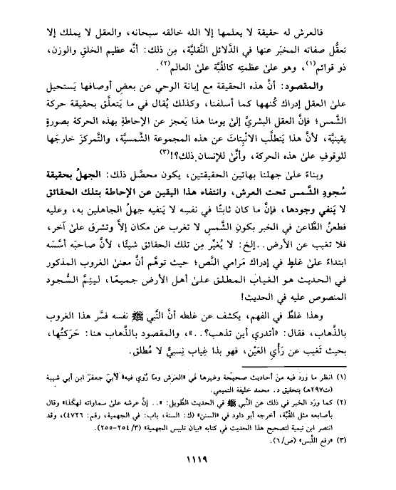 والمقصود: أنَّ هذه الحقيقة مع إبانة الوحي عن بعضِ أوصافها يَستحيل على العقل إدراك كُنهها كما أسلفنا، وكذلك يُقال في ما يَتعلَّق بحقيقة حركة الشَّمس؛ فإنَّ العقل البشريَّ إلى يومنا هذا يَعجز عن الإحاطةِ بهذه الحركة بصورةٍ يقينيَّة، لأنَّ هذا يَتطلَّب الانْبِتاتَ عن هذه المجموعة الشَّمسيَّة، والتَّمركزَ خارجَها للوقوفِ على هذه الحركة، وأنَّى للإنسان ذلك؟! (¬٣)