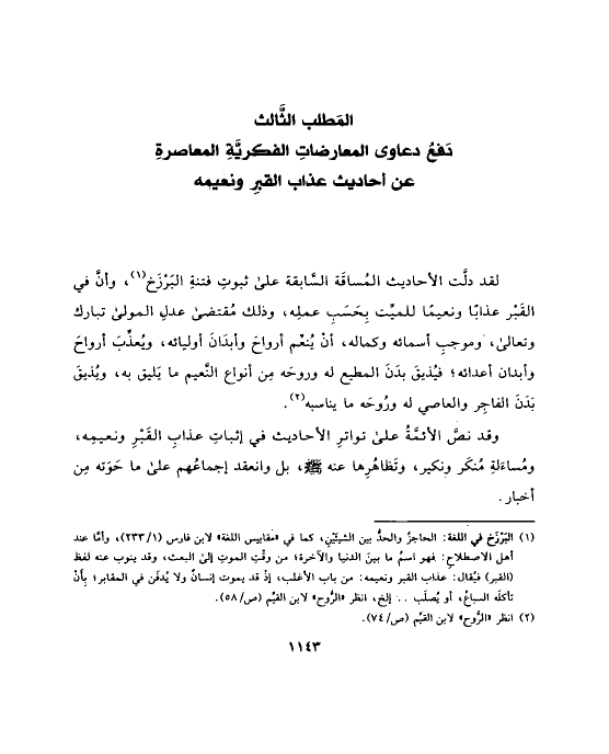 (¬١) البَرْزَخ في اللغة: الحاجزُ والحدُّ بين الشيئَيْنِ، كما في «مقاييس اللغة» لابن فارس (١/ ٢٣٣)، وأمَّا عند أهل الاصطلاحِ: فهو اسمُ ما بينَ الدنيا والآخرة؛ من وقْتِ الموتِ إلى البعث، وقد ينوب عنه لفظ (القبر) فيُقال: عذاب القبر ونعيمه: من باب الأغلب، إذْ قد يموت إنسانٌ ولا يُدفَن في المقابر؛ بِأَنْ تأكلَه السباعُ، أو يُصلَب .. إلخ، انظر «الرُّوح» لابن القيِّم (ص/٥٨).