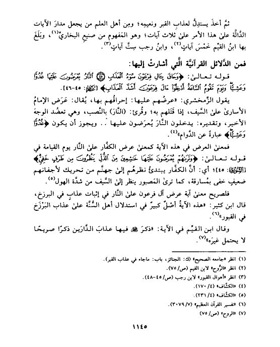 ثمَّ أخذَ يستدِلُّ لعذابِ القبر ونعيمِه؛ ومِن أهل العلم من يجعل مدارَ الآيات الدَّالَّة على هذا الأمر على ثلاث آيات؛ وهو المَفهوم من صنيعِ البخاريِّ (¬١)، وبَلَغَ بها ابنُ القيِّم خَمْسَ آياتٍ (¬٢)، وابنُ رجب سِتَّ آياتٍ (¬٣).