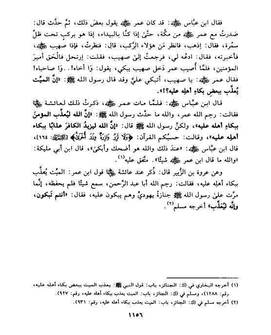 فقال ابن عبَّاس رضي الله عنه: قد كان عمر رضي الله عنه يقول بعضَ ذلك، ثمَّ حدَّث قال: صَدرتُ مع عمر رضي الله عنه من مكَّة، حتَّى إذا كنَّا بالبيداء، إذا هو بركبٍ تحت ظلِّ سمُرة، فقال: اِذهب، فانظر مَن هؤلاء الرَّكب، قال: فنظرتُ، فإذا صهيب رضي الله عنه، فأخبرته، فقال: ادعُه لي، فرجعتُ إلى صهيب، فقلت: اِرتحل فالْحَق أميرَ المؤمنين، فلمَّا أُصيب عمر دَخل صهيب يبكي، يقول: وَا أخاه! .. وَا صاحباه! فقال عمر رضي الله عنه: يا صهيب، أتبكي عليَّ وقد قال رسول الله صلى الله عليه وسلم: «إنَّ الميِّت يُعذَّب ببعضِ بكاءِ أهلِه عليه؟!».
