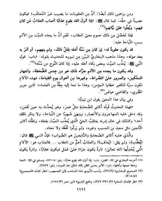 والَّذي عليه أَكابر الصَّحابةِ والتَّابعينَ هو الصَّواب؛ فإنَّ النبي صلى الله عليه وسلم قال: (يُعذَّب)، ولم يقل: (يُعاقب)! والعذابُ أعمُّ من العقاب .. فالعذاب هو: الآلام الَّتي يُحْدِثُها الله تعالى؛ تارةً يكون جزاءً على عَمَل فيكون عقابًا، وتارةً يكون