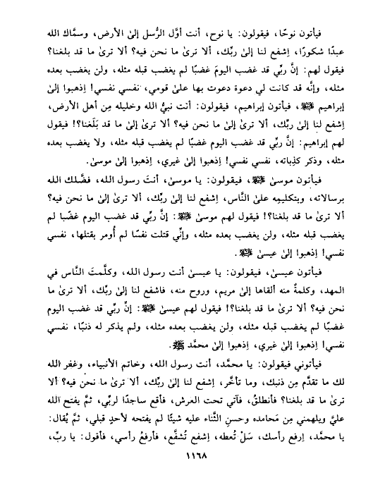 فيأتون موسى عليه السلام، فيقولون: يا موسى، أنتَ رسول الله، فضَّلك الله برسالاته، وبتكليمِه على النَّاس، اِشفع لنا إلى ربِّك، ألا ترى إلى ما نحن فيه؟ ألا ترى ما قد بلغنا؟! فيقول لهم موسى عليه السلام: إنَّ ربِّي قد غضب اليوم غضبًا لم يغضب قبله مثله، ولن يغضب بعده مثله، وإنِّي قتلت نفسًا لم أُومر بقتلها، نفسي نفسي! اِذهبوا إلى عيسى عليه السلام.