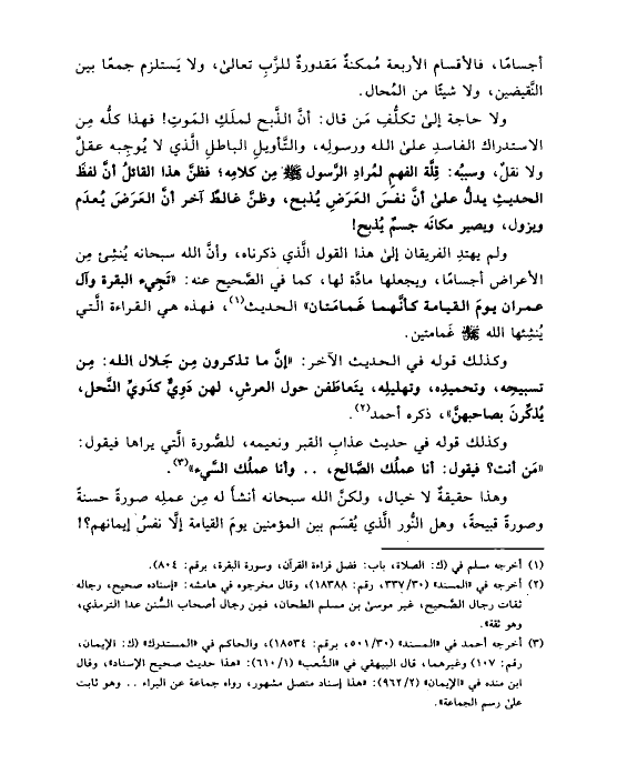 ولا حاجة إلى تكلُّفِ مَن قال: أنَّ الذَّبح لملَكِ المَوتِ! فهذا كلُّه مِن الاستدراك الفاسدِ على الله ورسولِه، والتَّأويلِ الباطلِ الَّذي لا يُوجِبه عقلٌ ولا نقلٌ، وسببُه: قِلَّة الفهمِ لمُرادِ الرَّسول صلى الله عليه وسلم مِن كلامِه؛ فظنَّ هذا القائلُ أنَّ لفظَ الحديثِ يدلُّ على أنَّ نفسَ العَرَضِ يُذبح، وظنَّ غالطٌ آخر أنَّ العَرَضَ يُعدَم ويزول، ويصير مكانَه جسمٌ يُذبح!